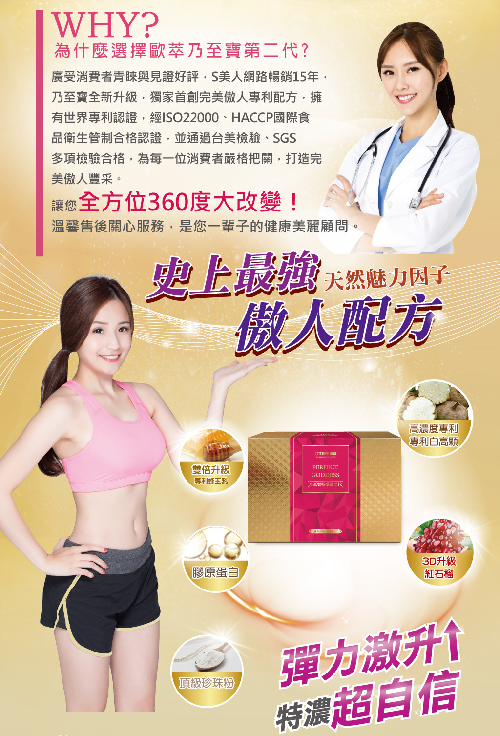 成 分: 白高顆、紅花苜蓿、野石榴萃取粉、專利素食人蔘膠原蛋白、專利蜂王乳、大豆萃取物(含去醣大豆基異黃酮)、超微奈米珍珠粉、山藥萃取粉、蠶絲蛋白、微膠囊化鐵、麥芽糊精、二氧化矽