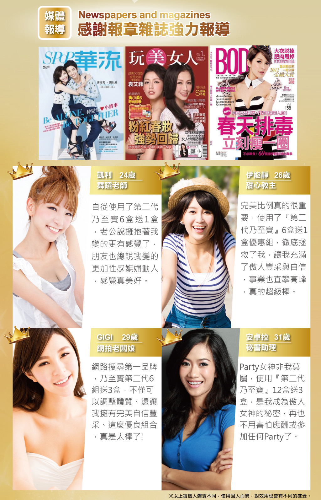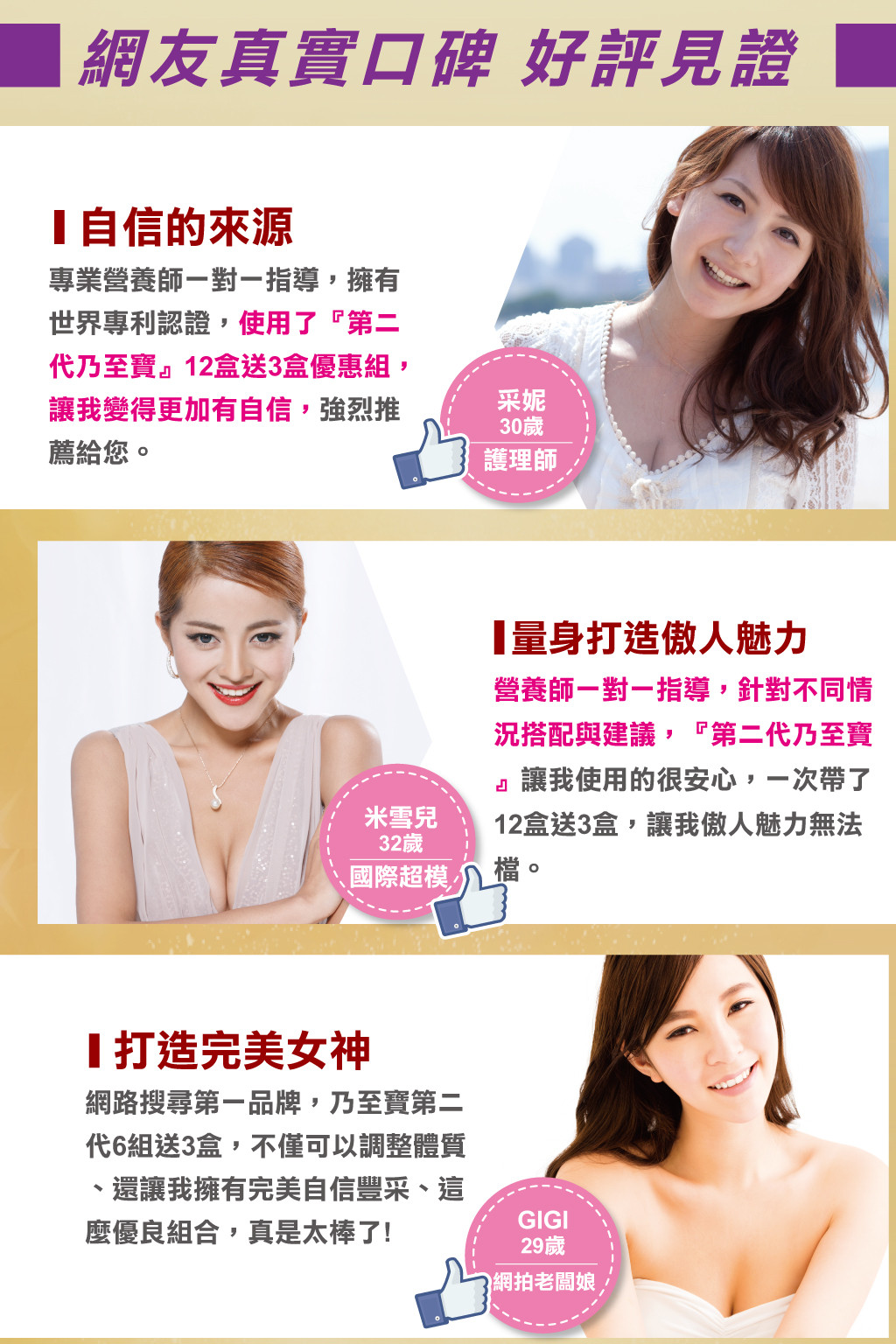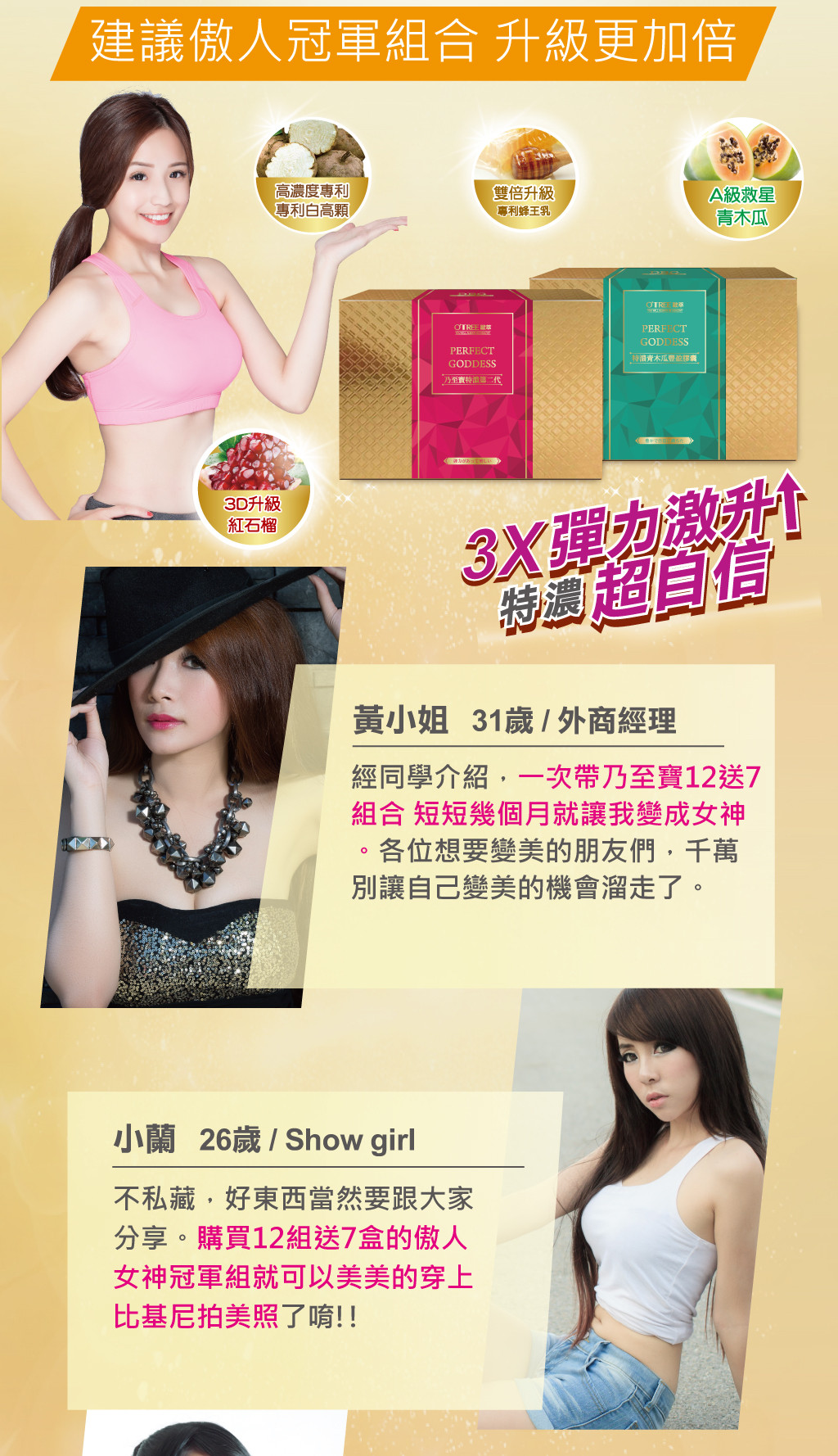 ‧使用期間建議搭配【特濃青木瓜豐盈膠囊】、【鑽透膠原蛋白美顏粉】或【活力美胸霜按摩使用】,使目標更快速達成。