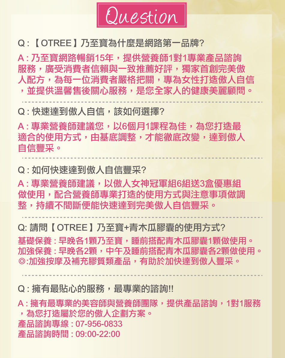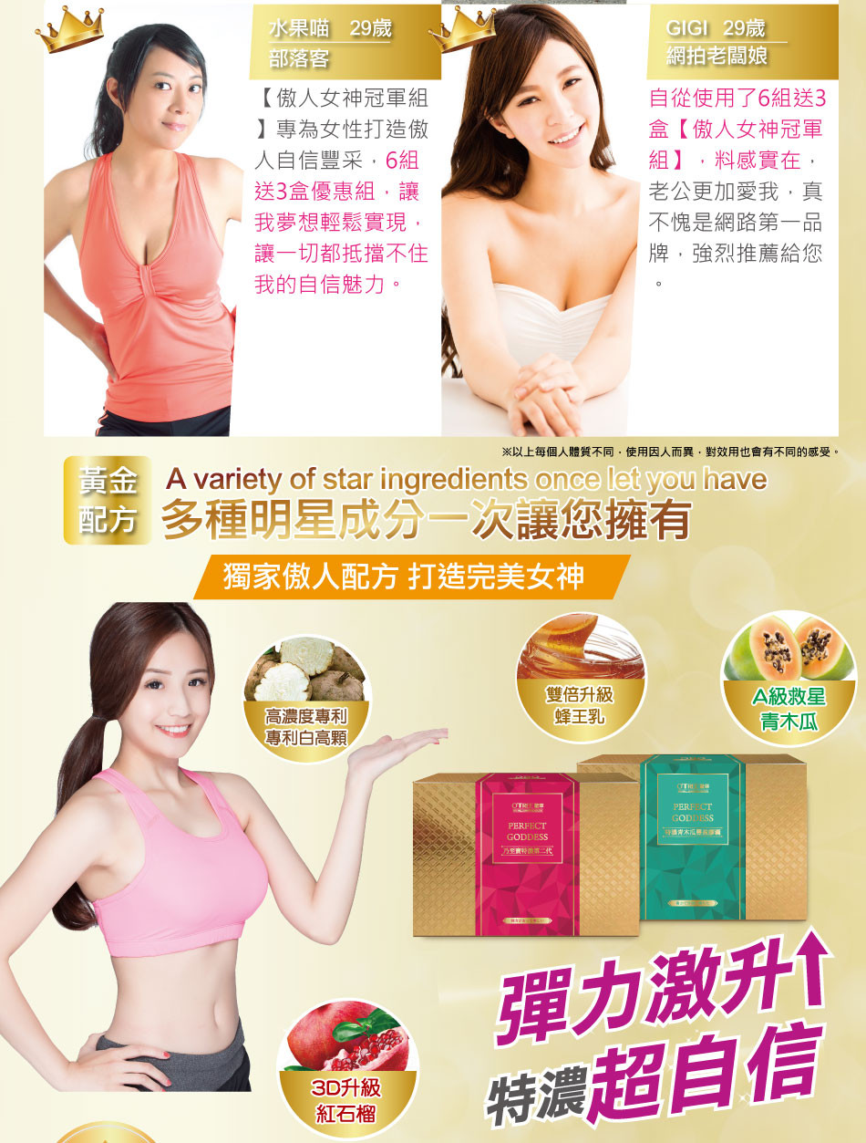 ‧乃至寶使用期間建議搭配【特濃青木瓜豐盈膠囊】、【鑽透膠原蛋白美顏粉】或【活力美胸霜按摩使用】,使目標更快速達成。